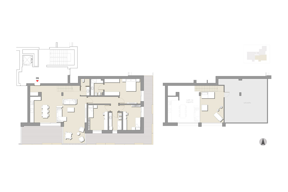Particolare soluzione abitativa al piano primo, di 191,87 mq. commerciali così composta: ingresso, salone con veranda, cucina/pranzo, soppalco di mq. 19,48, con possibilità realizzo di una zona ripostiglio attigua allo stesso e con affaccio sul soggiorno sottostante, bagno di servizio, disimpegno notte, camera matrimoniale con cabina armadio e bagno ad uso esclusivo, altre due camere con bagno, per un totale di mq. 155,90; il loggiato e la balconata, che si sviluppano lungo tuti i die fronti abitativi, hanno una superficie di mq. 47,64.